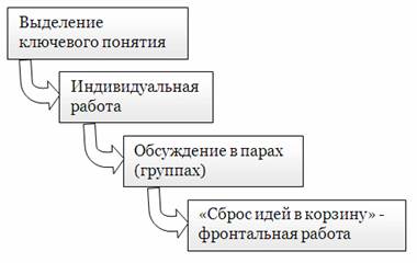 Описание приёма: Это прием организации индивидуальной и групповой работы учащихся на начальной стадии урока, он позволяет выяснить все, что знают или думают ученики по обсуждаемой теме урока. Учитель выделяет ключевое понятие изучаемой темы и предлагает учащимся за определенное время выписать как можно больше слов или выражений, связанных, по их мнению, с предложенным понятием. Важно, чтобы школьники выписывали все, приходящие им на ум ассоциации. Пример "корзины идей": - Тема нашего урока: Наши праздники. Что такое праздник? Для эффективной систематизации полученной информации можно совместить приём "корзина идей" с каким-либо графическим приёмом представления информации. Например, на этапе системаизации полученной информации можно нарисовать на доске кластер. Цели приёма: