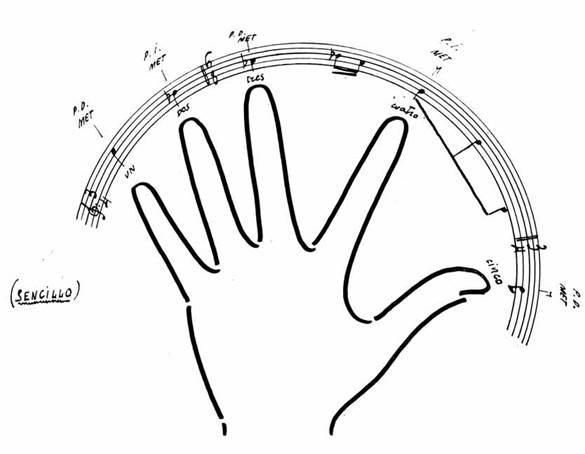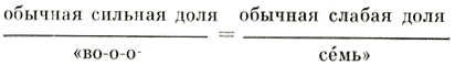 На жаргоне фламенко синкопа обычно обозначается восклицаниями "ммм-тá" или "таииú-татá". Для большей наглядности покажем это сменой ударения в числительных при счете. Итак, считая "сее-éмь", "воо-сéмь", опускаем ногу на пол всей ступней (ступ) в тот момент, когда произносим второй, ударный слог. Сделаем таким образом 3-е упражнение сапатеадо; обозначившийся ритм подходит для танцев солеарес, канья и других, см. схему 1.