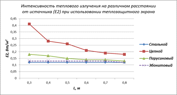 Интенсивность теплового излучения на различном расстоянии от источника (Е2) при использовании теплозащитного экрана