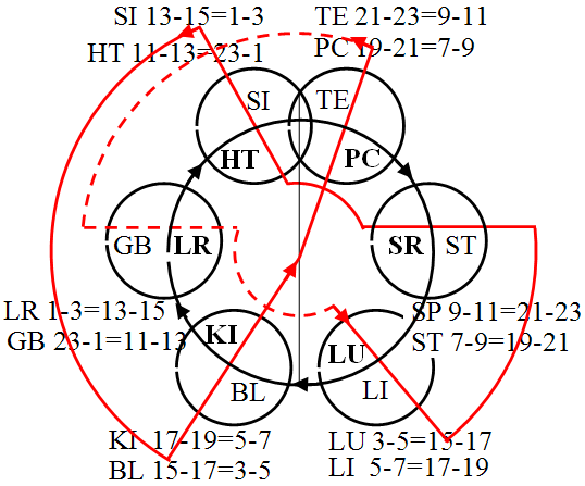 Çã³äíî êàíîí³÷íî¿ òåîð³¿, öèðêóëÿö³ÿ åíåð㳿 â 12-òè êàíàëàõ (ìåðèä³àíàõ) ï³äïîðÿäêîâàíà äâîõ ãîäèííîìó á³îëîã³÷íîìó ðèòìó (çàñòîþ) â ôóíêö³îíàëüíèõ êîìïëåêñàõ "Ñïàðåí³ êàíàëè". öå ñóïðîâîäæóºòüñÿ ïîñë³äîâí³ñòþ ìàêñèìàëüíî¿ òà ì³í³ìàëüíî¿ àêòèâíîñò³ ì³æ åëåìåíòàìè ïî ïðàâèëó "ϳâäåíü-ϳâí³÷" (òåîð³ÿ Ó-ѲÍ).