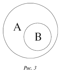 Подчинение (субординация). Отношение субординации характерно тем, что объем одного понятия полностью входит в объем другого, но не исчерпывает его, а составляет лишь часть. Когда в отношение подчинения входит два понятия, каждое из которых является общим (но не единичным), понятие А (подчиняющее) становится родом, а В (подчиненное) — видом. То есть понятие «планета» будет родом для понятия «Земля», а последнее есть вид. Бывают случаи, когда отдельное понятие может быть одновременно и родом, и видом. Это происходит, если понятиерод, содержащее в себе понятие-вид, относится к третьему понятию, которое шире последнего по объему. Получается тройное подчинение, когда более общее понятие подчиняет менее общее, но одновременно находится в отношении подчинения с другим, имеющим больший объем. В качестве примера можно привести следующие понятия: «биолог», «микробиолог» и «ученый». Понятие «биолог» является подчиняющим по отношению к понятию «микробиолог», но подчинено понятию «ученый». Это отношения род — > вид — > индивид. В таком отношении находятся, к примеру, понятия «планета» и «Земля»; «спортсмен» и «боксер»; «ученый» и «физик». Как несложно заметить, здесь объем одних понятий шире, чем других. Ведь Земля суть планета, но не каждая планета является Землей. Кроме Земли есть еще Марс, Венера, Меркурий и еще множество планет, в том числе неизвестных человеку. Та же ситуация возникает и в других приведенных примерах. Не каждый спортсмен — боксер, но боксер — это всегда спортсмен; любой физик есть ученый, но, говоря об ученом, мы не всегда подразумеваем физика и т. д. Здесь одно из понятий является подчиненным, другое — подчиняющим. Очевидно, что подчиняет понятие, имеющее больший объем. Подчиняющее понятие обозначается буквой А, подчиненное — буквой В. На схеме отношение подчинения отображается в виде двух кругов, один из которых вписан в другой (рис 3).
