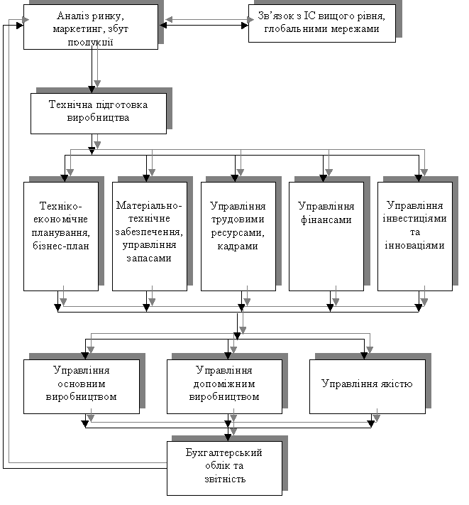 Рисунок 2. Укрупнена функціональна декомпозиція інформаційної системи промислового підприємства Функціональна структура інформаційної системи менеджменту в організації може складатись із взаємодіючих підсистем різноманітних напрямків, реалізованих у вигляді автоматизованих робочих місць заданих тематичних профілів та певних рангів. Глибина ієрархічного заглиблення профільованих автоматизованих робочих місць залежить від рівня iєрархiї об’єкту управління. Окремі пiдрежими в системі не ізолюються один від одного, а взаємодіють між собою на рівні єдиного інформаційного середовища, використовуючи одні і ті ж дані. Взаємодія між ними може носити, як непрямий, так і прямий характер. Важливо, щоб переходи між режимами в межах одного шару могли здійснюватися лише через вищі або їх узагальнюючі шари. В рамках кожного пiдрежиму, як правило, повинні передбачатися наступні загальноприйняті допоміжні пiдрежими: звертання про допомогу; робота із словником; інформація про створення нового об’єкту; види об’єкту. Модульний принцип побудови інформаційної системи менеджменту із максимально можливим використанням серійно виготовлюваних технічних засобів та використанням проблемно-орієнтованих пакетів прикладних програм дозволяє швидко адаптувати її для конкретного використання в конкретній організації.