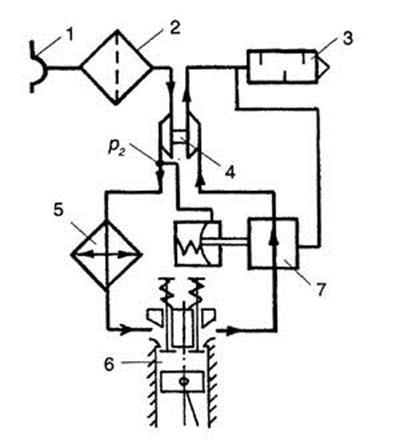 Рис. 4.2.5. Схема регулирования давления наддува перепуском отработавших газов с использованием в качестве управляющей величины давления р2: (обозначения элементов см. на рис 4.2.4)
