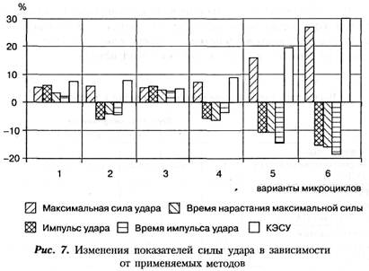 Вариант первого тренировочного микроцикла, в котором сначала применялись методы увеличения скоростных, скоростно-силовых и силовых возможностей, показал незначительное увеличение максимальной силы удара на 4,3%, но при этом показатели, характеризующие скоростные и скоростно-силовые возможности, ухудшились на 1,8-5,3%. По-видимому, применение методов развития силового потенциала удара в конце цикла сводит на нет развитие скоростных и скоростно-силовых возможностей спортсменов, что приводит к небольшому увеличению КЭСУ на 6,3%. Вариант второго тренировочного микроцикла, в котором применялись методы увеличения скоростных, силовых и скоростно-силовых возможностей, показал незначительное увеличение максимальной силы удара на 5,3%, при этом показатели, характеризующие скоростные и скоростно-силовые возможности, улучшились на 4,3-6,4%. Результаты исследования показали, что применение методов развития силового потенциала удара между скоростным и скоростно-силовым воздействием приводит к улучшению скоростных и скоростно-силовых возможностей спортсменов и увеличению КЭСУ на 7,1%. Вариант третьего тренировочного микроцикла, в котором сначала применялись методы увеличения скоростно-силовых, затем скоростных и в конце - силовых возможностей показал незначительное увеличение максимальной силы удара на 4,8%, но при этом показатели, характеризующие скоростные и скоростно-силовые возможности, ухудшились на 3,8-5,5%. Третий микроцикл по своим воздействиям на организм спортсменов похож на первый и приводит к небольшому увеличению КЭСУ на 4,8%. Вариант четвертого тренировочного микроцикла, в котором сначала применялись методы увеличения скоростно-силовых, затем силовых и в конце скоростных возможностей показал незначительное увеличение максимальной силы удара на 6,7%, и при этом показатели, характеризующие скоростные и скоростно-силовые возможности, улучшились на 4,2-6,7%. Результаты исследования выявили схожесть изменений в данных четвертого и второго микроциклов и примерно одинаковое увеличение КЭСУ - на 8,2%. Вариант пятого тренировочного микроцикла, в котором сначала применялись методы увеличения силовых, затем скоростных и в конце скоростно-силовых возможностей, показал значительное увеличение максимальной силы удара - на 15,2%, при этом показатели, характеризующие скоростные и скоростно-силовые возможности улучшились на 10,5-14,4%. Значительное увеличение максимальной силы удара и показателей, характеризующих скоростной и скоростно-силовой потенциал, привело к увеличению КЭСУ на 17,9%. Такое сочетание методов позволяет постепенно реализовывать приобретенный силовой потенциал в скоростной и на его основе увеличивать показатели скоростно-силовых качеств спортсменов. Вариант шестого тренировочного микроцикла, в котором сначала применялись методы увеличения силовых, затем скоростно-силовых и в конце скоростных возможностей, показал наиболее значительное увеличение максимальной силы удара - на 25,2%, при этом показатели, характеризующие скоростные и скоростно-силовые возможности, улучшились на 15,4-18,6%. Наиболее значительное увеличение максимальной силы удара и показателей, характеризующих скоростной и скоростно-силовой потенциал, привело к увеличению КЭСУ на 29,6%. Из результатов эксперимента видно, что такое сочетание методов является н