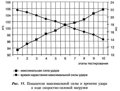 Во втором микроцикле применялись средства скоростно-силовой нагрузки, после которой показатели силы удара в экспериментальной группе изменялись следующим образом (рис. 11, 12). Показатели максимальной силы и времени нарастания удара постепенно увеличивались в течение всего микроцикла (рис. 11). Таким образом, видно, что скоростно-силовое воздействие на организм спортсменов привело к увеличению максимальной силы и улучшению времени нарастания максимальной силы удара. Отставленный тренировочный эффект силового воздействия включил адаптационные механизмы организма и привел к значительному увеличению скоростно-силового потенциала удара.