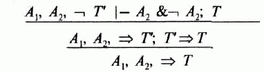 Косвенная аргументация – та, в которой используются допущения, т. е. рассуждение в ней осуществляется по непрямым правилам вывода. В ней выводимость { А 1..., Аn} Þ Т обосновывается на основе других обоснованных выводимостей. Один из ее видов заключается в следующем. Требуется обосновать некоторое утверждение (тезис). Выдвигается утверждение, являющееся отрицанием тезиса т. е. антитезис (допущение косвенной аргументации). Из имеющихся аргументов и антитезиса выводят (дедуктивно или индуктивно) противоречие (конъюнкцию некоторого утверждения и отрицания этого утверждения). В результате делается вывод об обоснованности (полной или частичной) тезиса. Если тезис обозначить буквой Т, множество аргументов – Г, а следование (индуктивное или дедуктивное) – знаком Þ, или чертой, то схематически косвенную аргументацию можно изобразить так: