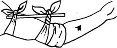 Якщо з якихось причин потерпілий не був доставлений у медичний заклад і йому не було зроблено хірургічну обробку рани протягом 1,5 год., слід виконати пальцеве притискування артерії і послабити джгут на 5—10 хв., щоб уникнути змертвіння тканин. Потім потрібно знову накласти джгут, але вже вище попереднього місця. Таку процедуру необхідно виконувати кожні 30—40 хв. до моменту доставки хворого у лікарню. При цьому щоразу треба робити відповідну відмітку в записці. У разі відсутності джгута використовують закрутки, зроблені з мотузки, ременя чи скрученої серветки (мал. 8). При цьому слід бути обережними, оскільки такі засоби менш еластичні і можуть швидше призвести до травмування не тільки нервових стовбурів, а й тканин та м'язів. Максимальне згинання кінцівки у суглобі так само може сприяти тимчасовій зупинці кровотечі. В цьому випадку кінцівку надійно фіксують у положенні, за якого витікання крові найменше (мал. 9). Тимчасову зупинку зовнішньої венозної та капілярної кровотеч виконують за допомогою тугих пов'язок. Рану закривають серветкою чи згорнутим у 5—6 шарів бинтом, зверху кладуть гігроскопічну вату і міцно забинтовують. Щоб зменшити кровотечу, доцільно пошкоджену частину тіла підняти відносно положення тулуба. Особливо небезпечними бувають кровотечі з вен із варикозним розширенням на ногах. Такі вени можуть лопатися, завдаючи значних пошкоджень. Допомогу слід подавати так само, як і за будь-якої венозної кровотечі, але з особливою обережністю.
