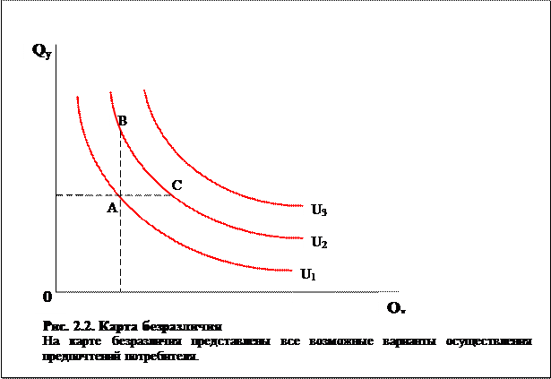 Несмотря на то, что в рамках кардиналистского подхода можно, как мы выяснили, понять мотивы поведения рационального потребителя в направлении поиска равновесного состояния, сам факт невозможности количественно измерить полезность подрывает доверие к этой модели. Это заставило экономистов заняться поиском другого способа описания спроса потребителей, который бы не был связан с необходимостью количественного измерения полезности. В результате такого поиска и появилась ординалистская модель. В рамках ординалистского подхода исследование потребительского поведения базируется не на определении величины полезности, как это было при кардиналистском анализе, а на выявлении более предпочтительного для потребителя набора благ. То есть, вместо ответа на вопрос насколько полезно то или иное благо, мы должны сосредоточиться на выяснении того, что полезнее. Нас уже как бы не интересует величина полезности каждой альтернативы сама по себе, мы просто стремимся выстроить стоящие перед потребителем альтернативы в некий условный ряд, показывающий возрастание или убывание полезности этих альтернатив. Другими словами, в ординалистской модели вместо количественного ранжирования используется порядковое ранжирование. При этом для определения места той или иной альтернативы в нашем условном ряду мы по-прежнему будем использовать введенные в кардиналистской модели понятия общей полезности и предельной полезности. Но если раньше мы акцентировали свое внимание на их значении, то теперь нашей задачей является определение того, какое благо обладает большей полезностью. Прежде чем мы начнем рассмотрение ординалистской модели, введем несколько упрощающих допущений (в дополнение к тем, которые использовались нами в кардиналистской модели). 1. Мы полагаем, что блага, которые выбирает наш потребитель, бесконечно делимы. 2. Мы будем по-прежнему, исходить из того, что наш потребитель обладает всей полнотой информации о полезности благ, а также имеет вполне определенные вкусы и предпочтения и способен ранжировать стоящие перед ним альтернативы; 3. Мы также полагаем, что предпочтения потребителя транзитивны. Это чисто логическое правило, в соответствии с которым мы полагаем что если некий набор А предпочтительнее для потребителя, чем набор Б, а набор Б предпочтительнее, чем набор В, это дает нам основание полагать, что набор А предпочтительнее для нашего потребителя, чем набор В; 4. Наш потребитель всегда предпочитает большее количество благ меньшему их количеству. То есть мы полагаем, что предельная полезность дополнительного потребления всегда положительна. 5. Выбор нашего потребителя ограничивается двумя благами. То есть наборы, которые мы будем ранжировать, включает в себя два блага. Поэтому функция общей полезности в нашем анализе имеет следующий вид: Главным инструментом анализа потребительских предпочтений в рамках ординалистской модели являются кривые безразличия. Введение в экономический анализ этого понятия базируется на том, что в реальности всегда существует множество наборов, включающих в себя определенные блага, между которыми потребитель не делает никаких различий. Это наборы безразличия, то есть наборы, потребление которых обеспечивает потребителю получение одинакового удовлетворения. Таким образом, кривая безраз