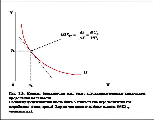 Знак «–» в формуле Предельную норму замещения можно выразить и по-другому. Поскольку все точки на кривой безразличия показывают различные наборы из двух видов благ, обеспечивающие потребителю одинаковый уровень удовлетворения, попытаемся описать перемещение из одной точки в другую, находящуюся в непосредственной близости от нее. Понятно, что такое перемещение не изменит общего удовлетворения потребителя, а приведет только к тому, что другими станут его составляющие. Если мы будем двигаться вниз по кривой безразличия, то это будет означать, что количество благ