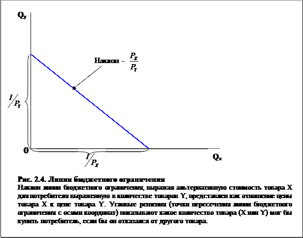 Однако предпочтения потребителя – это не единственный фактор, влияющий на его выбор. Существенное влияние на этот процесс оказывают также доход, которым располагает потребитель и цены, по которым он покупает товары на рынке. В совокупности эти два параметра определяются как бюджетное ограничение потребителя (consumer budget constraint). Для упрощения, мы продолжаем пользоваться введенными ранее допущениями, ограничивая анализ двумя товарами, полагая, при этом, что доход потребителя (I), то есть сумма денег, доступная для расходования, постоянен в рассматриваемой нами перспективе. Мы также полагаем, что цены, то есть сумма денег, которую потребитель должен заплатить за единицу каждого товара ( Если потребитель потратит весь свой доход на приобретение товаров