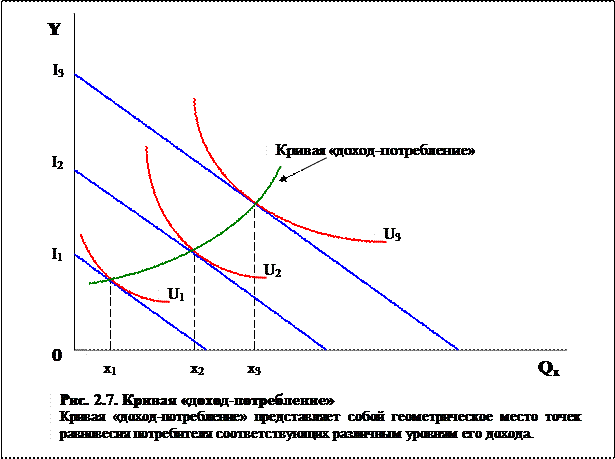 При изменении дохода потребителя происходят и изменения в покупаемом количестве товара. Кривая «доход-потребление» (income-consumption curve) показывает, сколько товара будет куплено потребителем при различных уровнях его дохода (Рис.2.7.). На нашем рисунке увеличение дохода потребителя сопровождается возрастанием покупок товара . Это свидетельствует о том, что товар – это нормальное благо. Но так бывает не всегда. Покупки различных товаров меняются при изменении дохода потребителя по-разному. Однако исследование зависимости между этими двумя параметрами с помощью модели потребительского выбора усложняется необходимостью построения кривых безразличия и поиска точек равновесия. Поэтому связь между доходом потребителя и количеством покупок изучается с помощью кривых Энгеля, названных так в честь Эрнста Энгеля, который в 19 веке исследовал изменение характера потребления товаров при изменении доходов потребителей.
