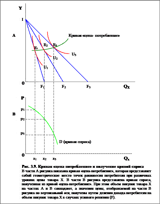 Анализ кривых безразличия может быть использован для объяснения того, как модель поведения потребителя согласуется с законом спроса. Предположим, что цена товара последовательно снижается, при том, что цены других товаров, а также доход потребителя не изменяются. Снижение цены товара приведет к тому, что линия бюджетного ограничения приобретает меньший наклон, а потребитель находит новую точку равновесия на более высокой кривой безразличия. При этом он увеличивает потребление данного товара, приравнивая с предельной полезностью новую более низкую цену (см.: Рис. 2.9.). Если мы соединим все точки равновесия потребителя при различных уровнях цены на товар , то получим кривую «цена-потребление». Таким образом, кривая «цена-потребление» (price-consumption curve) – это кривая, соединяющая все точки равновесия потребителя при различных уровнях цены на товар. На рисунке 2.9. обозначены точки пересечения линий бюджетного ограничения, соответствующих различным уровням цены, с осью QX. Эти точки показывают, какое количество товара мог бы купить потребитель, если бы он потратил на него весь свой доход. Они обозначены F1,F2,F3. По этим точкам легко можно посчитать цену товара , соответствующую каждому бюджетному ограничению: