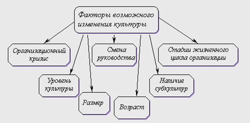 Критерии воздействия культуры на эффективность деятельности организации (т.е. к чему приводит культура в организации): 1) установка четких ориентиров для принятия управленческих решений; 2) создание атмосферы доверия; 3) определение приоритетов в работе; 4) повышение квалификации работников; 5) пресечение интриг; 6) определение политики в области подбора кадров и мотивации.