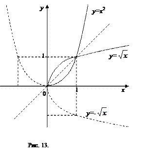 б). Квадратичная функция. Квадратичной функцией называется функция вида y = ax 2+ bx+c, где a, b, c – постоянные и а ≠ 0. Графиком квадратичной функции является парабола с вершиной в точке М 0 Если а > 0, то ветви параболы направлены вверх, при а < 0 – вниз. На рис. 15.17. приведен график параболы у = х 2. На промежутке (-¥, 0] эта функция убывает, а на промежутке [0, +¥) – возрастает. Не являясь взаимно однозначной, функция у = х 2 не имеет обратной. Однако, если рассмотрим функцию у = х 2 на промежутке [0, +¥), то она взаимно однозначна и имеет обратную: у = График обратной функции у =