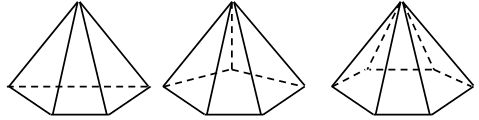 – Разделите данные равенства по группы. – Постарайтесь найти не одно решение. Укажите признаки выделения каждой группы. 2. В ы п о л н е н и е задания № 292 (1). – Рассмотрите рисунки в пункте 1. – Что их объединяет? (Это все объемные тела.) – Какие тела называют объемными? – Как называются эти объемные тела? (Пирамида, конус, цилиндр, куб.) – Под какими номерами изображен цилиндр? (2, 7.) – Назовите номера пирамид. (1, 3.) – Найдите и запишите номера объемных тел на рисунке, при изображении которых использовали условные обозначения? (5 и 6.) – Как называются эти обозначения? (Штриховой линией.) – Что они обозначают? (Невидимые линии.) – Рассмотрите рисунки под номерами 1 и 3. – Что вы можете о них сказать? (Это пирамиды. На рисунке нет штриховой линии.) – Можно ли при этом сказать, какая фигура лежит в основании этих пирамид? (Нет.) – Изобразите в тетради возможные варианты решений, используя условные обозначения.