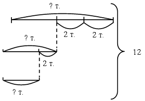Р е ш е н и е: 1) 1 + 1 + 1 = 3 (т.) – больше у старшего и среднего брата, чем у младшего. 2) 9 – 3 = 6 (т.) – три равных части. 3) 6: 3 = 2 (т.) – у младшего брата. 4) 2 + 1 = 3 (т.) – у среднего брата. 5) 3 + 1 = 4 (т.) – у старшего брата. О т в е т: 4 т., 3 т., 2 т. – Изменится ли разница между количеством тетрадей старшего и младшего братьев, если всего братья купили бы 12 тетрадей? (Не изменится.) – Измените данные в задаче так, чтобы эта разница стала другой. З а д а ч а. Три брата купили вместе 12 тетрадей. Младший брат взял на 2 тетради меньше, а старший на 2 тетради больше, чем средний. Сколько тетрадей взял каждый брат?