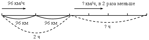 Р е ш е н и е: 1) Весь путь со скоростью 96 км/ч автомобилист ехал 4 часа, значит, половину пути он с этой скоростью проедет за 2 часа, так как 4: 2 = 2 (ч). 2) Оставшийся путь он мог проехать за 2 часа со скоростью 96 км/ч, но так как скорость уменьшилась в 2 раза, значит, время движения увеличилось в 2 раза, то есть 2 ∙ 2 = 4 (ч). 3) На весь путь автомобилист в данном случае потратит: 2 + 4 = 6 (ч). О т в е т: 6 ч.