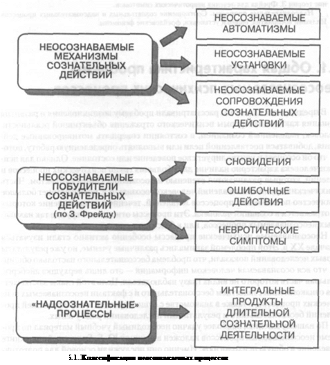 6.1. Общая характеристика проблемы неосознаваемых психических процессов В предыдущих главах мы рассматривали проблему возникновения и развития сознания как высшей формы психического отражения объективной реальности. Человек, наделенный сознанием, в состоянии совершать мотивированные действия, добиваться поставленной цели или выполнять определенную работу, потому что он осознает и контролирует свое поведение или состояние. Однако для психики человека характерно наличие двух больших групп психических процессов и явлений, которые различаются степенью их осознания самим субъектом. Часть психических процессов и явлений человеком осознаются, но существует большое количество психических процессов и явлений, течение или проявление которых не отражается в сознании человека. Эти процессы относятся к группе так называемых неосознаваемых процессов, или к бессознательному. Неосознаваемые психические процессы особенно активно стали изучаться в начале XX в. Этой проблемой занимались различные ученые, но уже результаты первых исследований показали, что проблема бессознательного настолько обширна, что вся осознаваемая человеком информация — это лишь верхушка айсберга, большая часть которого не видна глазу наблюдателя. Цель этой главы заключается в ознакомлении с понятием бессознательного и с фактами неосознаваемых психических процессов, а также в знакомстве с существующей классификацией проявлений бессознательного и результатами исследований ряда ученых. По нашему мнению, наиболее удачно необходимый учебный материал по проблеме неосознаваемых процессов изложен в лекциях Ю. Б. Гиппенрейтер в книге «Введение в общую психологию». Именно они послужили основой для подготовки данной главы и рассмотрения изучаемой нами проблемы. Все неосознаваемые психические процессы принято разделять на три класса: неосознаваемые механизмы сознательных действий, неосознаваемые побудители сознательных действий, «подсознательные» процессы (рис. 6.1). В свою очередь, в первый класс — неосознаваемых механизмов сознательных действий — входят три подкласса: неосознаваемые автоматизмы; явления неосознаваемой установки; неосознаваемые сопровождения сознательных действий.