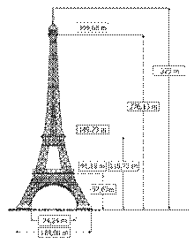 Вес металлической конструкции — 7 300 тонн (полный вес 10 100 тонн). Сегодня из этого металла можно было бы возвести сразу три башни[. Фундамент выведен из бетонных массивов. Колебания башни во время бурь не превышают 15 см. Нижний этаж представляет собой пирамиду (129,2 м каждая сторона в основании), образуемую 4 колоннами, соединяющимися на высоте 57,63 м арочным сводом; на своде находится первая платформа Эйфелевой башни. Платформа представляет собой квадрат (65 м в поперечнике). На этой платформе поднимается вторая пирамида-башня, образуемая также 4 колоннами, соединяющимися сводом, на котором находится (на высоте 115,73 м) вторая платформа (квадрат в 35 м в поперечнике). Четыре колонны, возвышающиеся на второй платформе, пирамидально сближаясь и постепенно переплетаясь, образуют колоссальную пирамидальную колонну (190 м), несущую на себе третью платформу (на высоте 276,13 м), также квадратной формы (16,5 м в поперечнике); на ней высится маяк с куполом, над которым на высоте 300 м находится площадка (1,4 м в поперечнике). На башню ведут лестницы (1792 ступени) и лифты. На первой платформе были возведены залы ресторана; на второй платформе помещались резервуары с машинным маслом для гидравлической подъёмной машины (лифта) и ресторан в стеклянной галерее. На третьей платформе размещались астрономическая и метеорологическая обсерватории и физический кабинет. Свет маяка был виден на расстоянии 10 км. Огромная железная башня не особо страдает от ветра. Даже самый сильный ветер, случившийся в Париже (примерно 180 км/ч), отклонил верхушку башни лишь на 12 см. Значительно больше на неё действует Солнце. Обращенная к солнцу сторона расширяется от жары так, что верхушка отклоняется в сторону на 18 см. Форма