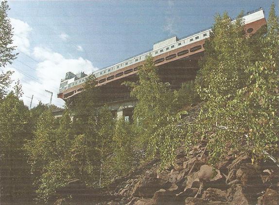 Наклонный судоподъёмник Красноярского гидроузла (перспективное изображение): 1 – здание диспетчерского пульта; 2 – поворотное устройство; 3 – монтажно-ремонтная площадка; 4 – судовозная камера с судном