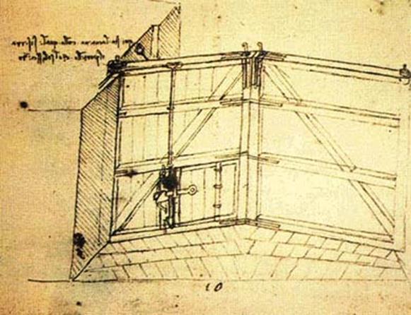 Ворота для шлюза Леонардо усовершенствовал систему открытия и закрытия шлюзовых ворот. Он изобрел маленькие шлюзовые ворота с засовом в их основании. Засов позволял впустить то количество воды, которое было необходимо для выравнивания давления по обеим сторонам главных ворот, что облегчало их открытие.