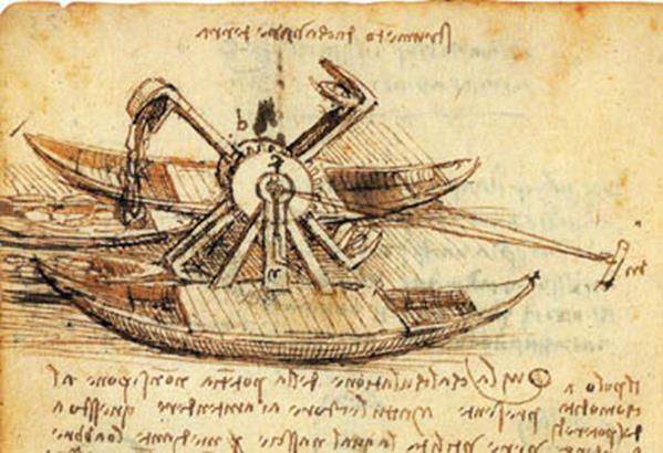 Дноуглубительный снаряд Для очистки каналов Леонардо изобрел драгу, помещаемую между двумя лодками и снабженную четырьмя лопастями. Лопасти приводились в движение рукоятью. По замыслу, собранный со дна ил складывался на плот, укрепленный между двумя лодками. При повороте колеса трос, привязанный к берегу, наматывался на барабан, что автоматически передвигало установку. Ось вращения барабана можно было установить вертикально. Тем самым регулировалась глубина выборки грунта.