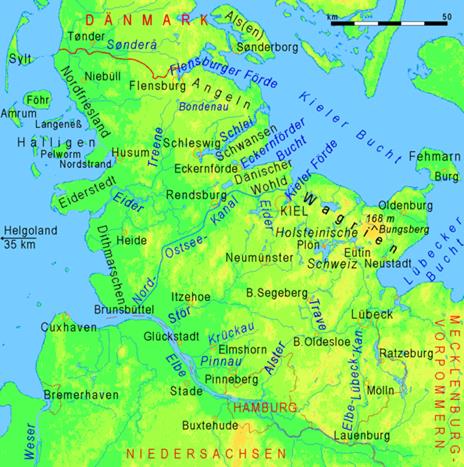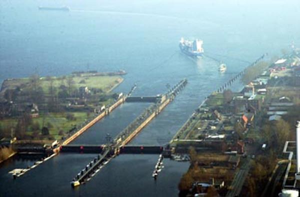 Кильский канал, соединяющий Северное и Балтийское моря по кратчайшему направлению между городами Киль и Бронцбутель, проходит от Кильской бухты, у города Киль (пригородный район Хольтенау) до устья реки Эльба, имеет длину 98,7 км. Он существенно сокращает расстояние для морских судов по сравнению с проходом вокруг Ютландского полуострова через проливы Скагеррак и Каттегат. Является одним из самых загруженных судоходных путей Европы. В 1996 году отметил 100-летие. Минимальная ширина – 50 м, глубина 11 м. По концам построены шлюзы, которые уже дважды перестраивались. Новые шлюзы двухниточные, одноступенчатые с размерами камер 330×45×14 м. На канале сделано 11 уширений с причалами для судов, ожидающих расхождения с встречными. Канал работает круглогодично. Причальные палы в виде кустов деревянных свай используются до настоящего времени, для чего приходится ежегодно приобретать в Южной Америке и в Африке сосны длиной 20 – 22 м и диаметром в тонком отрубе не менее 30 см., так как считается, что дерево наилучшим образом гасит энергию навала судна.