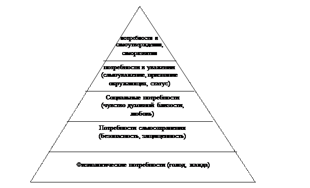- Представление о самом себе. Например, если кто-то мыслит себя творческой и активной личностью, то будет искать товар, отвечающий этим характеристикам. 4. Психологические факторы ( мотивация, восприятие, усвоение, убеждения и отношения) - Мотивация – это та сила, которая заставляет индивида совершать действия, направленные на удовлетворение тех или иных потребностей. Цель мотивационных исследований – выявление причин, влияющих на потребительское поведение. Человек в любой момент времени испытывает различные потребности. Однако большинство этих потребностей не являются достаточно сильными, чтобы мотивировать его действовать в данный момент времени. Потребность становится мотивом только тогда, когда достигает достаточного уровня интенсивности. В маркетинге при анализе поведения потребителей наиболее часто используются теории мотивации Фрейда и Маслоу. Достижения теории мотивации помогают определить общие типы мотивационной ориентации людей. В рамках этой теории используются различные подходы к типологии потребностей человека, их классификации. На основе психоаналитической модели Фрейда изучается процесс принятия решений о покупках потребителе. Предполагается, что люди не могут осознать истинных побудительных мотивов, движущих их поступками. Теория мотивации А.Маслоу направлена на объяснение, почему люди в качестве мотивов своего поведения в определенный момент времени имеют определенные потребности. По теории Маслоу все виды потребностей можно расположить в виде строгой иерархической структуры (рис.4). Согласно данной теории мотивации человек будет стараться удовлетворить самые важные потребности. По мере удовлетворения одних потребностей мотивом станут потребности более высоких уровней.