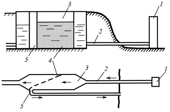 Запонь на водозаборе: 1 – оголовок; 2 – линия всасывания или самотечная линия; 3 – запонь