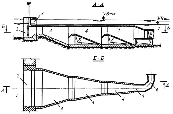 Рыбозащитный концентратор с вертикальной сепарацией рыб (РКВС): 1 – водозаборный водоем; 2 – оголовок рыбозащитного концентрирующего ссооружения; 3 – забральная стенка; 4 – лотки-концентраторы; 5 – оголовок рыбоотвода; 6 – рыбоотвод; 7 – водоприемник; 8 – водозаборные окна