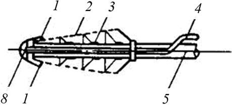 Зонтичный оголовок водозабора: 1 – зонтичный оголовок; 2 – оголовок водозаборной трубы; 3 – водоза6орная труба; 4 – опорная конструкция Другим защитным устройством для рыбы-«верховодки» может быть рыбозащитный концентратор с вертикальной сепарацией рыб. Здесь водозаборные окна расположены в нижней части лотка-концентратора в прикрыты наклонными экранами, которые исключают попадание рыбы в водозабор и направляют ее в рыбоотвод. Для отпугивания рыбы от оголовка водозабора используют специальные потокообразователи. Перфорированная труба водозабора, снабженная конической сеткой, прикрыта в торце экраном – потокообразователем. Вода, подаваемая по трубе насосом, создает защитный валец по поверхности сетки, который не пропускает рыбу.