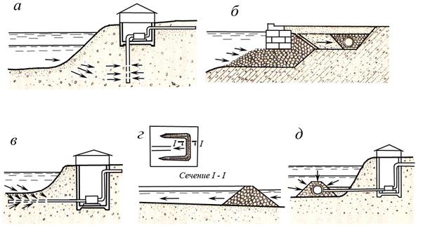 Фильтрационные водозаборы: а – с вертикальной скважиной; б – горизонтальный; в – с горизонтальной скважиной; г – с фильтрующими дамбами; д – с горизонтальным оголовком Конструкция рыбозащитного устройства с пневматической защитой глубинного водозабора приведена на следующем рисунке.