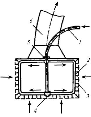 Оголовок с потокообразователем (РОП): 1 – потокообразователь; 2 – сетка; 3 – перфорированная всасывающая труба; 4 – водоподводящий тракт; 5 – водоприемная труба; 6 – оголовок Особой экологичностью без травмирования рыб отличаются фильтрационные грунтовые водозаборы. Недостатком таких водозаборов является высокое гидравлическое сопротивление и, как следствие, недостаточная пропускная способность. Для увеличения пропускной способности оголовок ограждают фильтрующей дамбой, образующей ковш водозабора.