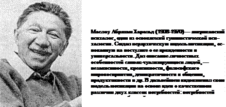 Таким образом, у Роджерса, как и в неофрейдизме, развитие личности определяется врожденной тенденцией. Социальная среда играет роль лишь внешнего, чуждого природе человека фактора давления. Другим не менее известным представителем гуманистической психологии является Г. Олпорт, который разработал психологическую теорию личности, получившую название теории черт. Согласно этой теории, люди отличаются друг от друга по набору и степени развития у них отдельных, независимых черт, а описание личности можно получить на основе тестологического или другого, менее строгого ее обследования, основанного, например, на обобщении жизненных наблюдений разных людей за данной личностью. По сути, Олпорт предложил методологию изучения личности, которая получила широкое распространение в рамках экспериментальной психологии личности. Поэтому с его подходом мы более подробно ознакомимся в следующем разделе этой главы. Ярким представителем гуманистического направления в психологии является А. Маслоу. Согласно его мнению, основная потребность человека — это самоактуализация, стремление к самосовершенствованию и самовыражению. На главный вопрос его теории — Что такое самоактуализация? — Маслоу отвечает: «Самоактуализирующиеся люди все без исключения вовлечены в какое-то дело... Они преданы этому делу, оно является чем-то очень ценным для них — это своего рода призвание». Все люди такого типа стремятся к реализации высших ценностей, которые, как правило, не могут быть сведены к чему-то еще более высокому. Эти ценности (среди них — добро, истина, порядочность, красота, справедливость, совершенство и др.) выступают для них как жизненно важные потребности. Существование для самоактуализирующейся личности предстает как процесс постоянного выбора, как непрестанное решение гамлетовской проблемы «быть или не быть». В каждый момент жизни у личности есть выбор: продвижение вперед, преодоление препятствий, неизбежно возникающих на пути к высокой цели, или отступление, отказ от борьбы и сдача позиций. Самоактуализирующаяся личность всегда выбирает движение вперед, преодоление препятствий. Самоактуализация — это процесс постоянного развития и практической реализации своих возможностей. Это «труд ради того, чтобы сделать хорошо то, что человек хочет сделать». Это «отказ от иллюзий, избавление от ложных представлений о себе». По мнению Маслоу, самоактуализация — явление врожденное, она входит в природу человека. Человек рождается с потребностями в добре, нравственности, доброжелательности. Они составляют ядро человека. И человек должен уметь эти потребности реализовать. Следовательно, самоактуализация — это одна из врожденных потребностей. Кроме этой потребности Маслоу выделяет в структуре личности еще несколько основных: потребность продолжения рода; потребность в пище; потребность в безопасности; потребность в защите; потребность в истине, добре и др. Говоря о различных теориях личности, мы не можем не сказать несколько слов о французской психологической школе и о ее наиболее выдающемся представителе П. Жане. Жане высказал мнение о том, что различные психические процессы представляют собой явления, подготавливающие действия. Чувства, мышление являются процессами, осуществляющими регуляцию действий. В основу развития личности им поло