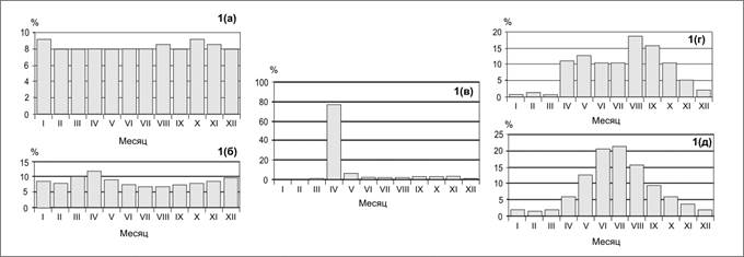 Задача 2. Установите, каким рекам – Висла, Кубань (верховья), Нил (верховья), Амур, Урал – соответствуют изображенные на рисунке 1 диаграммы внутригодового распределения стока (в % от годовой суммы). Какой основной источник питания характерен для каждой реки, и как это связано с особенностью внутригодового распределения стока?