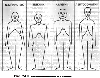 24.2. Краткий обзор учений о темпераменте Создателем учения о темпераменте считается древнегреческий врач Гиппократ (ок. 460-377 гг. до н. э.). Он утверждал, что люди различаются соотношением четырех основных «соков организма» — крови, флегмы, желтой желчи и черной желчи. Соотношение этих «соков организма» по-гречески обозначалось словом «красис" которое позже заменили латинским словом temperamentum — «соразмерность», «правильная мера». Опираясь на учение Гиппократа, другой знаменитый врач античности Клавдий Гален (ок. 130-ок. 200 гг.) разработал типологию темпераментов, которую он изложил в известном трактате «De temperamentum». Согласно его учению, тип темперамента зависит от преобладания в организме одного из соков. Им были выделены 13 типов темперамента, но затем они были сведены до четырех. Эти четыре названия типов темперамента вам хорошо известны: сангвиник (от лат. sanguis — кровь), флегматик (от герч. phlegma — слизь, мокрота), холерик (от греч. chole — желчь) и меланхолик (от греч. melas chole — черная желчь). Эта концепция имеет огромное влияние на ученых на протяжении уже многих столетий. Подтверждением этого является тот факт, что до настоящего времени предложенные Галеном названия типов темперамента являются самыми распространенными. В последующие века исследователи, наблюдая значительное разнообразие поведения, совпадающее с различиями в телосложении и физиологических функциях, пытались упорядочить и каким-то образом сгруппировать эти различия. В результате возникли многочисленные концепции и типологии темпераментов. В основу этих концепций были положены самые разнообразные черты личности. В ряде концепций свойства темперамента понимались как наследственные или врожденные и связывались с индивидуальными различиями в особенностях телосложения. Такие типологии получили название конституционных типологий. Среди них наибольшее распространение получила типология, предложенная Э. Кречмером, который в 1921 г. опубликовал свою знаменитую работу «Строение тела и характер». Главная его идея заключается в том, что люди с определенным типом телосложения имеют определенные психические особенности. Э. Кречмер провел множество измерений частей тела людей, что позволило ему выделить четыре конституциональных типа: лептосоматик, пикник, атлетик, диспластик (рис. 24.1). 1. Лептосоматик характеризуется хрупким телосложением, высоким ростом, плоской грудной клеткой, узкими плечами, длинными и худыми нижними конечностями. 2. Пикник — человек с выраженной жировой тканью, чрезмерно тучный, характеризуется малым или средним ростом, расплывшимся туловищем с большим животом и круглой головой на короткой шее. 3. Атлетик — человек с развитой мускулатурой, крепким телосложением, характерны высокий или средний рост, широкие плечи, узкие бедра. 4. Диспластик — человек с бесформенным, неправильным строением. Индивиды этого типа характеризуются различными деформациями телосложения (например, чрезмерный рост, непропорциональное телосложение).