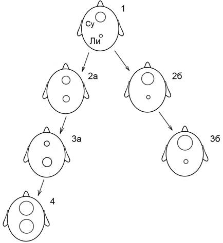 Рис. 6. Эволюционное развитие функций Су и Ли. 1) Хомо эргастер 2а) Современный Хомо эректусу наш прямой предок 2б) Хомо эректус 3а) Хомо сапиенс (современный человек) 3б) Неандерталец 4) Кроманьонец