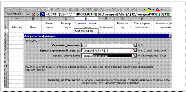 =ЕСЛИ($D2=«»; “ ”;ПРОСМОТР($D2;Номер товара; Наименование товара) (3.2) Правило набора формулы: