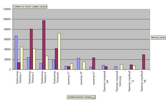 - Следует определить структуру сводной таблицы. Поместите в область строк кнопку Наименование товара, а в область столбцов – кнопку Месяц. Сумма будет вычисляться по полю Сумма заказа, т.е. переместите эту кнопку в область данных. Нажмите кнопку Готово.