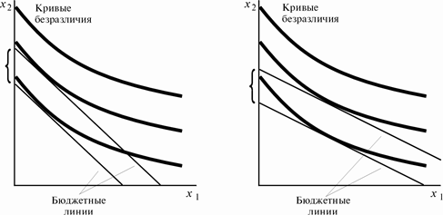 Один из способов ответа на данный вопрос состоит в том, чтобы спросить, сколько денег следует дать потребителю после изменения цены, чтобы его благосостояние осталось точно таким же, каким оно было до изменения цены. Применительно к графической иллюстрации, мы спрашиваем, как сильно вверх мы должны сдвинуть новую бюджетную линию, чтобы она стала касательной к кривой безразличия, проходящей через точку исходного потребления ( Другой способ измерить влияние изменения цены в денежных единицах состоит в том, чтобы спросить, сколько денег следовало бы забрать у потребителя до изменения цены, чтобы его благосостояние было точно таким же, каким оно стало после изменения цены. Эта мера называется эквивалентной вариацией дохода, поскольку она представляет собой изменение дохода, которое, с точки зрения полезности, эквивалентно изменению цены. Применительно к рис.14.4 мы спрашиваем, как сильно вниз мы должны сдвинуть исходную бюджетную линию, чтобы как раз коснуться кривой безразличия, проходящей через новый потребительский набор. Эквивалентная вариация дохода показывает максимальную величину дохода, с которой потребитель готов был бы расстаться, чтобы избежать изменения цены. Вообще, та сумма денег, которую потребитель был бы готов заплатить, чтобы избежать изменения цены, как правило, отличается от той суммы денег, которую следовало бы выплатить потребителю, чтобы компенсировать ему изменение цены. В конце концов, при разных комбинациях цен стоимость доллара для потребителя различна, поскольку на него он может приобрести разные величины потребления. Выражаясь языком геометрии, компенсирующая и эквивалентная вариации дохода — не что иное как два различных способа измерить то, "как далеко отстоят друг от друга" две кривых безразличия. В каждом из случаев мы измеряем расстояние между двумя кривыми безразличия расстоянием между касательными к ним. Вообще, эта мера расстояния будет зависеть от наклона касательных — то есть, от выбранных нами цен, определяющих наклон бюджетных линий. Однако, компенсирующая и эквивалентная вариации дохода одинаковы в одном важном случае — при квазилинейной функции полезности. В этом случае кривые безразличия параллельны, так что расстояние между кривыми безразличия, как показано на рис.14.4, остается одним и тем же, независимо от того, в какой точке его измеряют. В случае квазилинейной функции полезности компенсирующая вариация дохода, эквивалентная вариация дохода и изменение избытка потребителя дают одну и ту же меру денежной стоимости изменения цены.