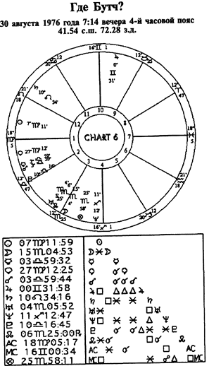 имеются два управителя. Другой результат расчета времени предлагает сходящийся секстиль Асцендента с Ураном с орбисом 9 градусов. В итоге получается, что автомобиль будет найден в пределах от 6 до 14 дней, с большей определенностью — от 6 до 9 дней. Чтобы определить фактическое расстояние от дома кверента до автомобиля, мы берем разницу в градусах между управителями — Ураном (для автомобиля) и Юпитером (управителем кверента). Мы имеем разницу в 14 градусов. Луна находится в мутабельном знаке и в падающем доме. Согласно таблице для вычисления расстояния умножаем 14 на 1,5 и получаем расстояние в 21 милю1. Автомобиль был найден через 8 дней после того, как был задан вопрос, на расстоянии около 20 миль от дома кверента. Автомобиль не был поврежден, но радиоприемник, колонки и магнитофон были похищены — из-за того, что ретроградный Юпитер находится во втором доме в Водолее (Водолей управляет электронным оборудованием), в квадрате к Асценденту2, то есть кверенту. Страховая компания не компенсировала ничего из нанесенного автомобилю ущерба, потому что кверент не закрыл дверь автомобиля на замок. Управитель кверента ретрограден во втором доме, последний аспект Луны — оппозиция с Венерой, стоящей в девятом доме — доме страхования, а Луна управляет восьмом домом — домом потерь и денег из других источников. Вместо P.S.: позднее было обнаружено, что один из воров был служащим кверента, как это и описано планетой Сатурн. ---------------------- 1 В тексте оригинала сказано почему-то «16,5 миль». (Примеч. пер.) 2 В карте этого аспекта на самом деле нет. (Примеч. пер.) КАРТА 6 30 августа 1976 года одна женщина обратилась ко мне и попросила помочь ей найти пропавшую собаку по кличке Бутч. Бутч пропал после 3 часов дня 27 августа. В течение трех дней клиентка старательно искала Бутча, справлялась у друзей, соседей и в местной ветеринарной лечебнице. Я попросил ее в деталях изложить историю этой собаки, чтобы получить ясные и точные указания в карте. (Гораздо легче, правда, иметь дело с членами семьи — из-за тесных связей между ними.) Женщина пояснила, что собака принадлежала ее приемной дочери, но последний год клиентка сама ухаживала за собакой, потому что приемная дочь переехала в апартаменты, где не разрешалось держать домашних животных. В течение этого года Бутч никогда не выбегал за пределы ее двора. Последний раз Бутча видели 27 августа около 2:50 дня. Когда я понял все обстоятельства, то отметил время и приступил к построению Карты 6. Собака принадлежала приемной дочери, которая управляется