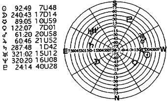 одиннадцатым домом, а собака, ее домашний любимец, управляется четвертым домом первоначальной карты, то есть шестым от одиннадцатого. Здесь собака принадлежит не кверенту, а другому человеку. Но так как вопрос был задан приемной матерью, то она и является кверентом, поэтому определение направления и расчет времени мы проводим исходя из ее местоположения. Управитель животного Юпитер находится в естественном девятом доме карты в знаке Близнецов, — это шестой дом от дома собаки. Юпитер стоит в первых градусах знака, и это означает, что местонахождение собаки только-только изменилось. Последний элемент, с которым Луна была в соединении, — это Северный Узел во втором доме. Это указывает на некий несчастный случай. Луна только что переместилась в третий дом — двенадцатый дом для собаки, что указывает на то, что совсем недавно что-то случилось. Так как это двенадцатый дом, то это означает, что собака самостоятельно отвязала поводок. Последним из предыдущих аспектов Луны был квадрат с Сатурном в одиннадцатом доме карты — восьмом доме собаки. Все эти негативные аспекты говорят о произошедших с собакой неприятностях. Меркурий управляет Асцендентом и, следовательно, кверентом (приемной матерью). Меркурий находится в первом доме в соединении с Марсом и Плутоном. Это обрисовывает состояние кверента. Из этих указаний следует, что она дала волю своим нервам, активно участвует в этом деле и немного мучится чувством вины. Это видно из того, что Асцендент находится в квадрате с Нептуном в третьем доме (ментальном доме) и Плутоном, — то есть управитель ее третьего дома в соединении с управителем кверента. Приемная дочь управляется Луной; соуправитель Луны — Сатурн. Она очень эмоционально отнеслась к этой ситуации, была несколько обижена и расстроена. Она верит в то, что собака была похищена, так как Сатурн прежде всего делает трин с Нептуном, управителем седьмого дома. Если бы собака была похищена, то управитель седьмого дома Нептун должен был бы делать тяжелые аспекты с управителями собаки — Юпитером или Луной. Оппозиция между Юпитером и Нептуном имеет слишком большой орбис. В своей работе я использую орбис 10 градусов. Поэтому мы с уверенностью можем сказать, что собака не была похищена. Юпитер, управляющий собакой, подтверждает, что собака породистая, а то, что он в Близнецах, показывает, что женщина имеет на собаку соответствующие бумаги. И Луна, и Уран находятся на «сожженном пути», так что могло случиться самое худшее. Юпитер в Близнецах управляет пустошью. Луна и