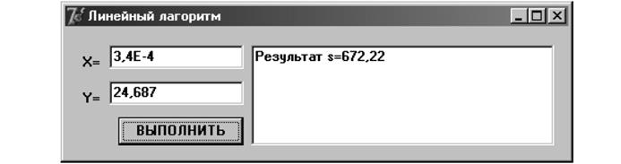 Рис. 1.3 Работа с программой происходит следующим образом. Нажмите (щелкните мышью) кнопку "Выполнить". В окне Мемо1 появляется результат. Измените исходные значения х, у в окнах TEdit и снова нажмите кнопку "Выполнить" - появятся новые результаты. Чтобы завершить работу программы, нужно нажать кнопку В Листинге 1.1 представлен текст программы.