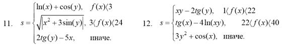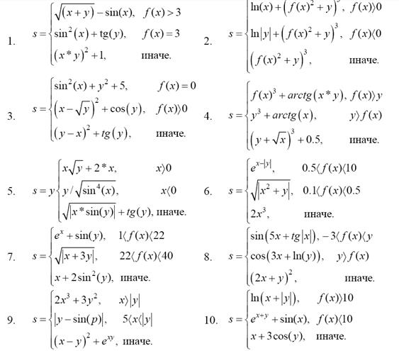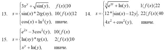 { Private declarations } Public { Public declarations } end; Var Form1: TForm1; Implementation {$R *.dfm} //---------------------------------------------------------- procedure TForm1.FormCreate(Sender: TObject); Begin Edit1.Text:='2'; Edit2.Text:='5,9'; Memo1.Clear; end; //----------------------------------------------------------- procedure TForm1.Button1Click(Sender: TObject); Var x,y,a,f,s:extended; Begin x:=StrToFloat(Edit1.Text); y:=StrToFloat(Edit2.Text); case RadioGroup1.ItemIndex of 0: f:=cos(x); 1: f:=sqr(x); 2: f:=sin(x); end; a:=sqr(x+y); if f > 0.5 then s:=a-sqrt(y) Else if (f > -0.5) and (f <= 0.5) then s:=a+power(x*y,3) else s:=a+ln(y); Memo1.Clear; Memo1.Lines.Add('Результат S='+FloatToStrF(s,ffFixed,8,3)); end; //----------------------------------------------------------------- end.