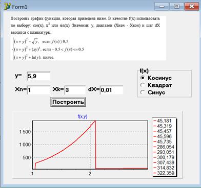 Построить график функции (с помощью компонента TChart), которая приведена ниже. В качестве f(x) использовать по выбору (компонент TRadioGroup): cos(x), x2 или sin(x). Значения: у, диапазон (Xнач - Хкон) и шаг dX вводятся с клавиатуры.