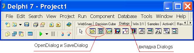 То, что мы рассмотрели выше, позволяет работать с файлами по адресу, жёстко записанному в тексте программы. Мы же хотим иметь возможность открывать любые файлы и работать с файлами по нашему выбору. Естественно, Delphi предоставляет нам такую возможность. Рассмотрим компоненты, позволяющие в работающей программе осуществлять выбор файлов. Delphi диалоги выбора файла позволяют указать програме, с каким файлом мы хотим работать. На вкладке палитры компонентов Dialogs находятся компонент Delphi OpenDialog и компонент Delphi SaveDialog. Все Delphi диалоги, находящиеся на этой вкладке, в том числе и Delphi диалоги выбора файла, невизуальные, т.е. при переносе их на Форму в работающей программе их не видно, они видны только на этапе конструирования. Компонент Delphi OpenDialog позволяет открыть в нашей программе стандартное Windows-окно диалога открытия файла, компонент Delphi SaveDialog - окно диалога сохранения.