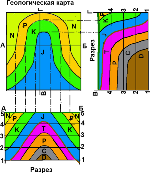 Рис. 2.6 Построение геологической карты, разрезов и структурной карты структурного седла (седловины)