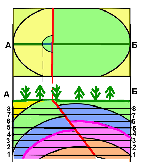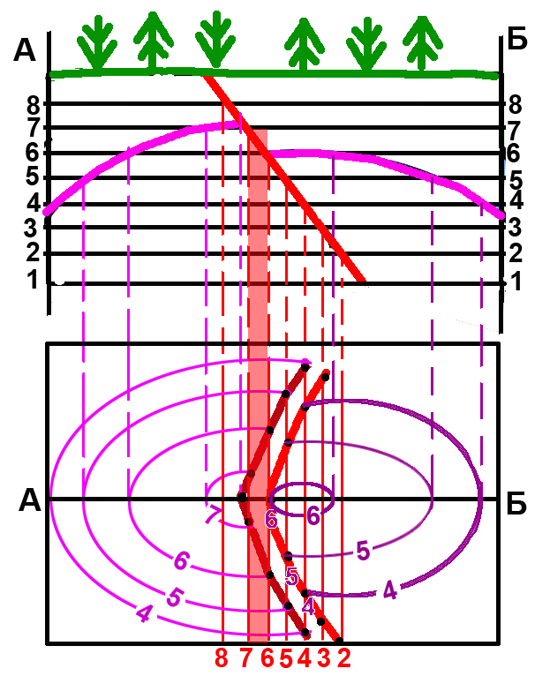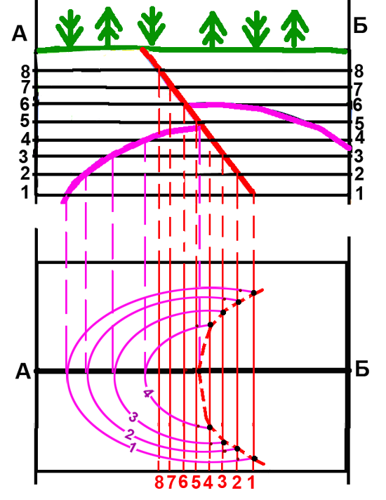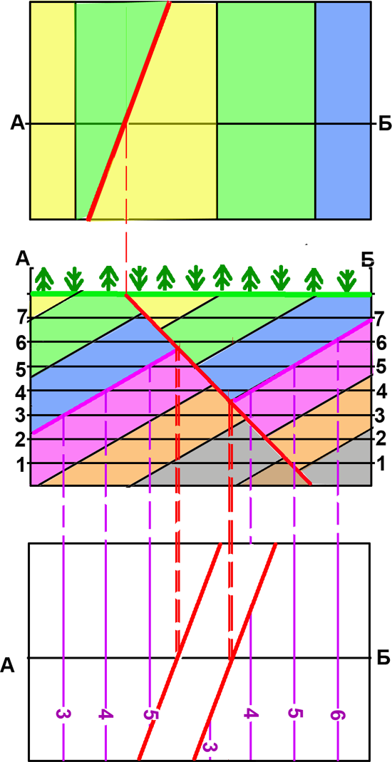 Цифры на разрезе показывают условные высоты, а раскраска – условно различные слои. Это могут быть любые другие цифры и слои – литологические пачки или стратиграфические подразделения. Для определенности будем условно полагать, что это толщи, соответствующие стратиграфическим подразделениям данной раскраски – карбон, пермь, юра, мел и палеоген. Сверху изображаем рамку будущей геологической карты и обозначаем линию разреза (АБ). Проецируем на эту линию выход разлома и геологических границ. То, что простирание разреза перпендикулярно линии разреза и простиранию складки – условность, по разрезу мы это определить не можем. Мы взяли именно этот случай произвольно, а могли бы взять любой другой. Через точку, соответствующую границе, выходящей на дневную поверхность (в нашем примере кровли юры) проводим часть овала, соответствующего очертаниям брахискладки, срезаемого разломом. Так как на поверхности у нас больше не выходит никаких других границ, условно изображаем фрагменты овала, срезаемого границами карты. Для построения структурной карты выбираем структурную поверхность. Например, это кровля триаса (показано сиреневым цветом на разрезе). Дальнейшие построения структурной карты касаются только этой поверхности. Рисуем рамку будущей карты и линию разреза на ней. Затем сносим на эту линию разреза точки пересечения разлома и высотных отметок и проводим серию линий, перпендикулярных линии разреза. Получается структурная карта разлома – наклонной плоскости. Естественно, что стратоизогипсы должны идти в том же направлении, что и геологическая граница (в нашем случае – в меридиональном направлении) (рис. 3.24).