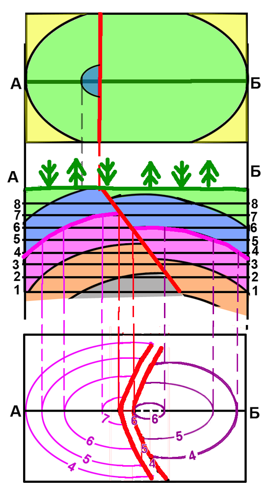 Раскрашиваем геологическую карту в цвета, принятые для соответствующих слоев на разрезе. По такому алгоритму можно построить любые структурные формы и их сочетания. Date: 2015-06-08; view: 1581; Нарушение авторских прав |