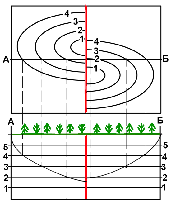При построении необходимо следить, чтобы простирание геологических границ на геологической и структурной картах совпадали, также, чтобы совпадали между собой и простирания разлома и линий пересечения разлома и пласта. 2. Изображение антиклинали, осложненной наклонным разломом Предположим, мы изображаем прямую округлую брахиморфную антиклиналь. Работу начинают с построения геологического разреза (рис. 3.23).